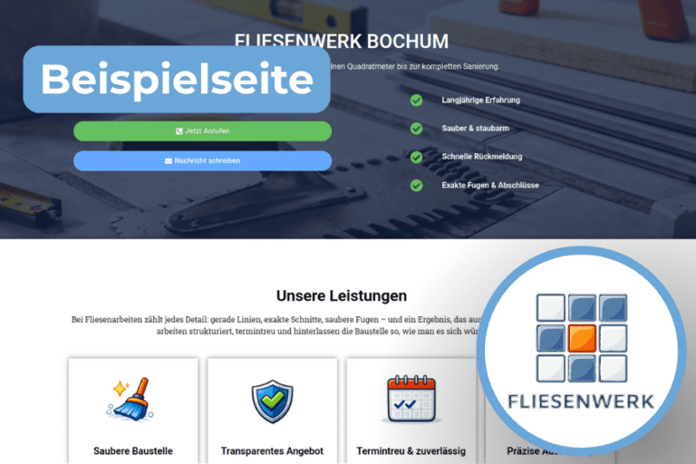 Fliesenwerk Bochum brauchte keine riesige Website, sondern eine klare Seite, die sofort zeigt: Was wird angeboten? und wie kann man Kontakt aufnehmen? Deshalb habe ich die Struktur so gebaut, dass Besucher innerhalb von Sekunden anrufen oder schreiben können.